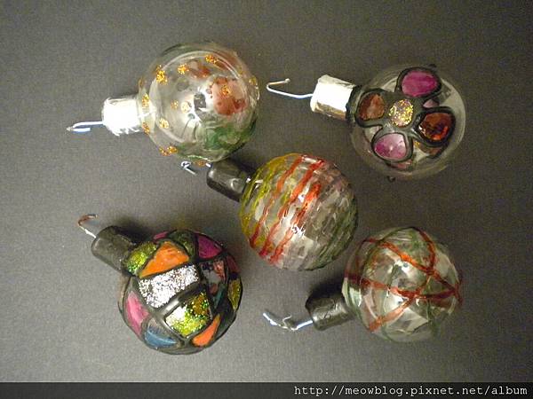 ↓ 另外這些玻璃球,用彩繪玻璃畫的專用顔料,塗鴉他們。 可以掛在聖誕樹上作裝飾。